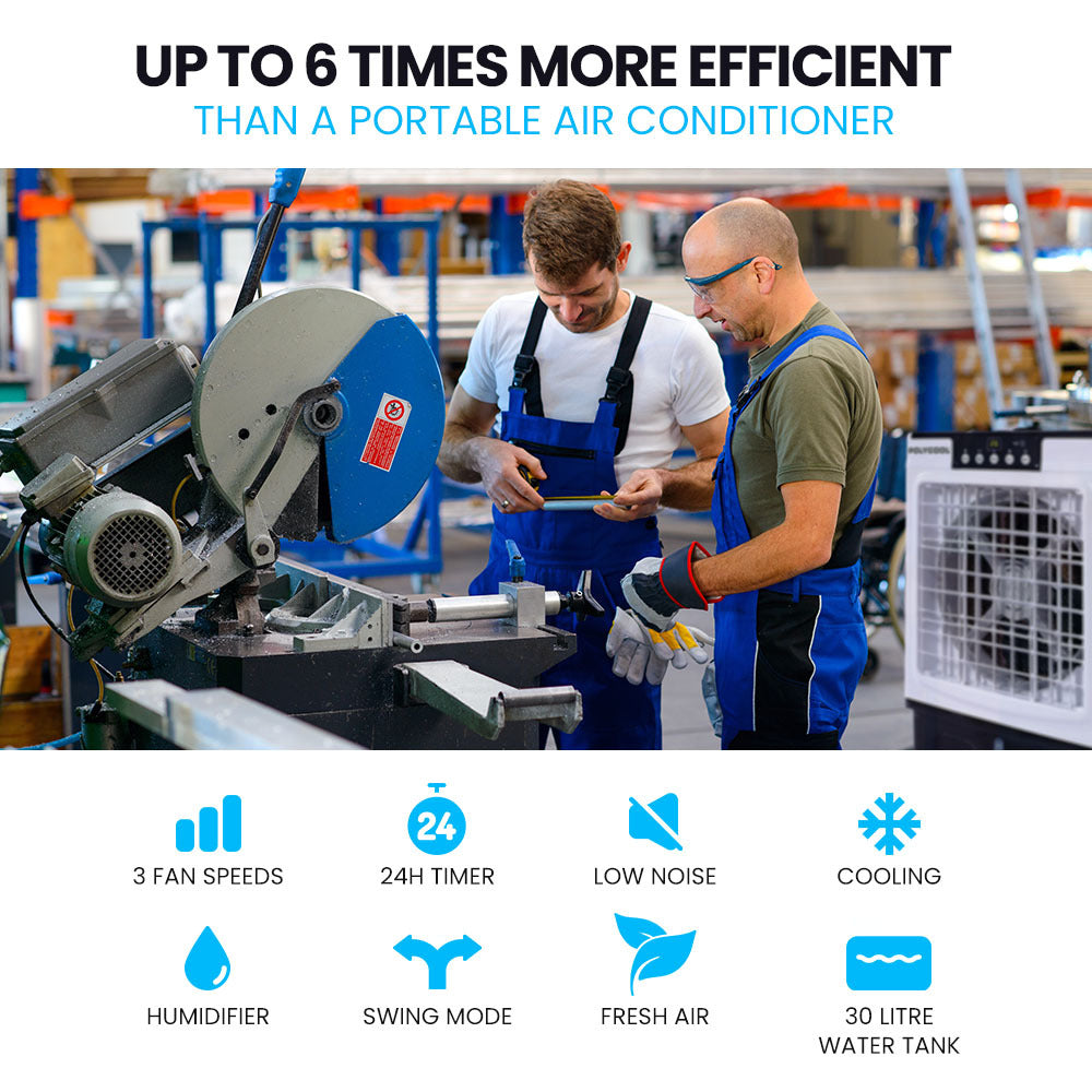 With an impressive airflow of up to 3,500m³/h, this cooler efficiently serves spaces up to 20m². Its generous 30L water tank ensures over 10 hours of continuous cool air, enhanced by two bonus ice packs for extra chill.