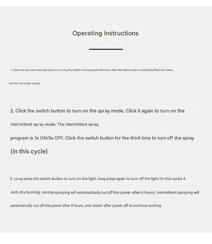 - Two Mist Modes: Choose between continuous spray (approx. 6 hours runtime) or intermittent spray (3 seconds on, 3 seconds off - approx. 8 hours runtime) to suit your needs.