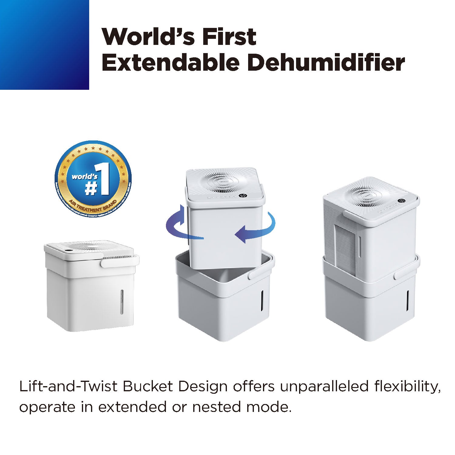 The Midea Cube dehumidifier stands out with its innovative lift-and-twist design, offering unmatched versatility. In its extended form, it boasts a 12L tank that can handle up to 20 liters of moisture removal daily, significantly reducing the need for frequent emptying.