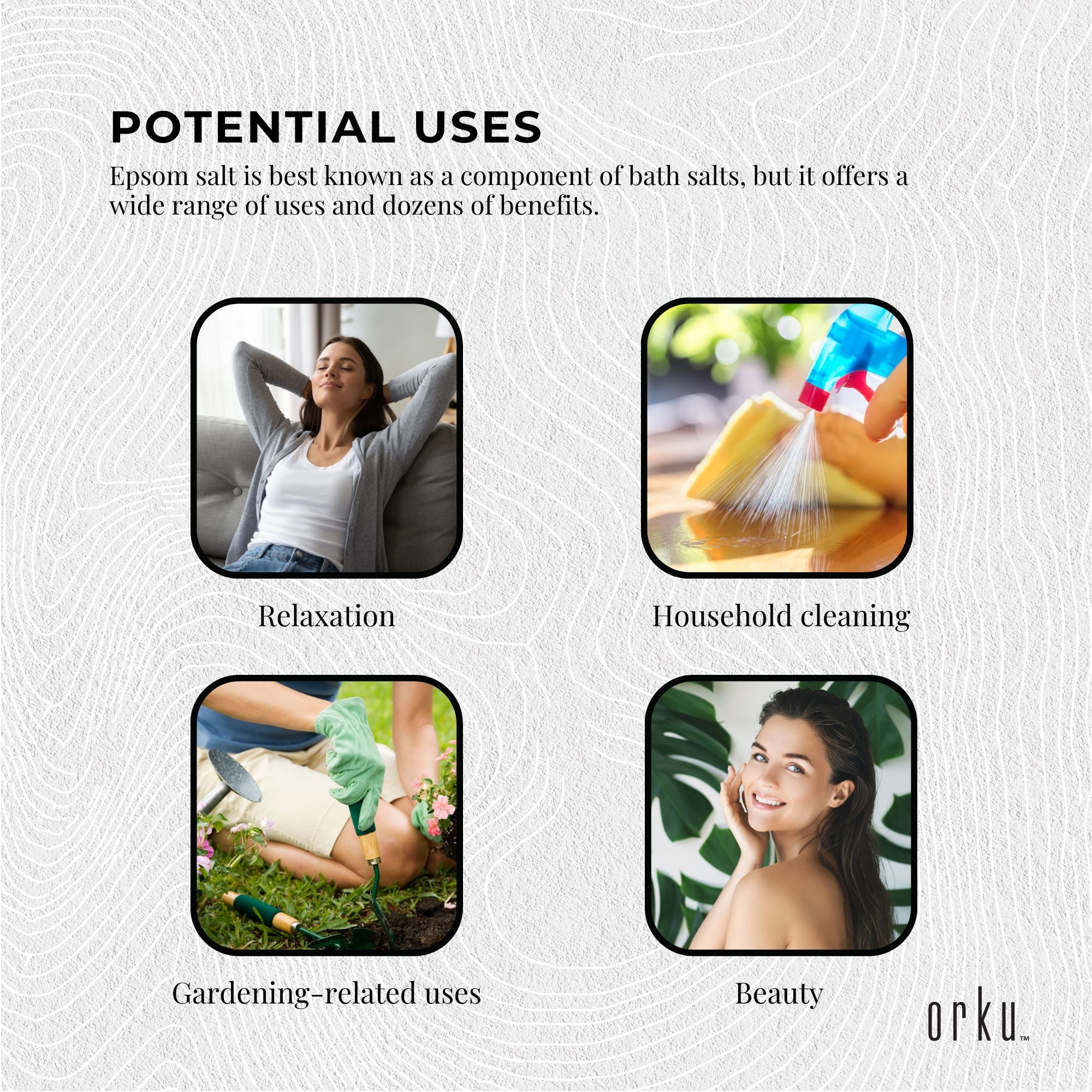 Packaged in a resealable bag, the Orku Epsom Salt is perfect for families seeking natural solutions for everyday needs.